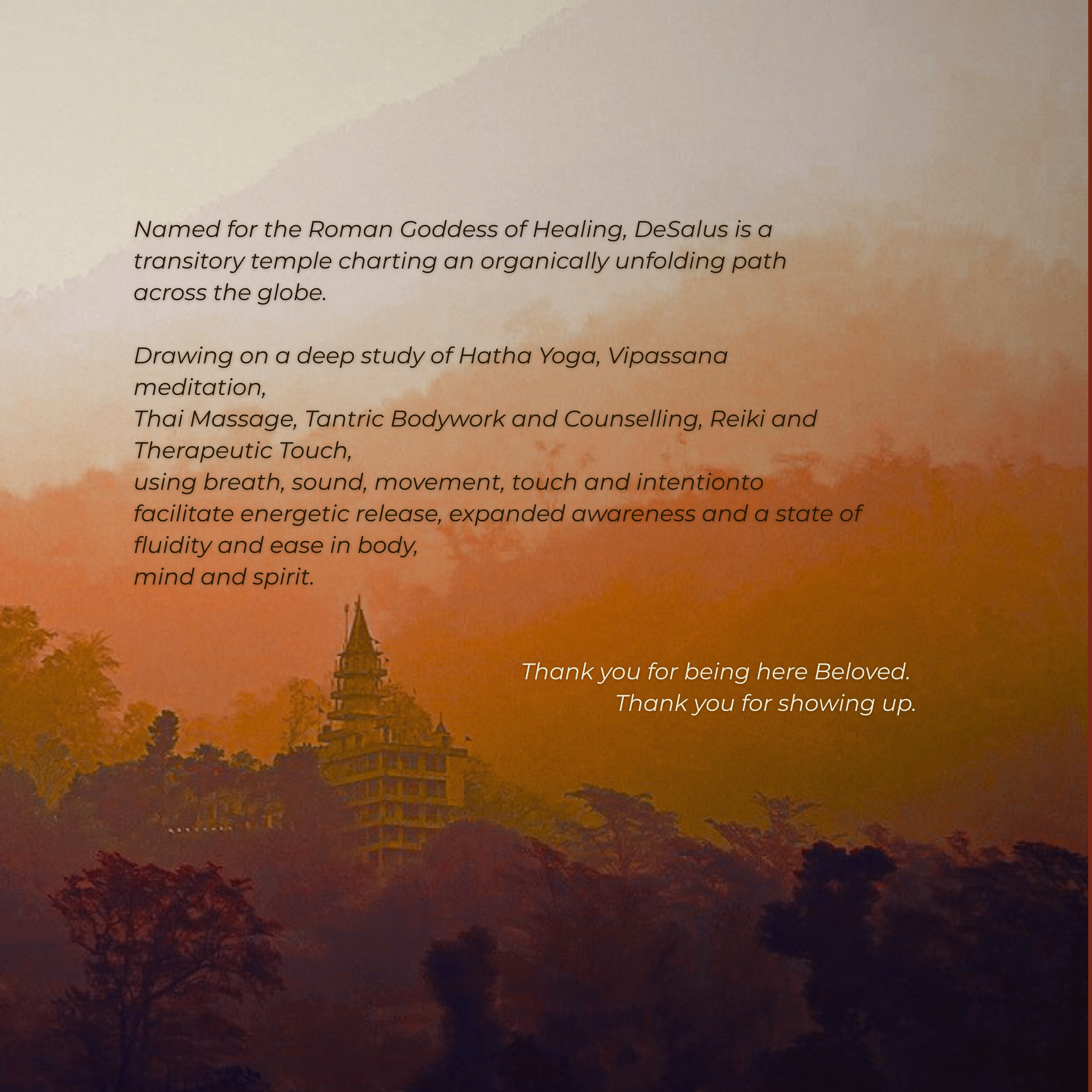 Her path centered for many years in India where she studied Hatha Yoga intensively in Rishikesh with Surinder Singh and Ashish Sharma and Vipassana Meditation in the lineage of Goenka and Sayagyi U Ba Khin. Her study of Thai Massage in Northern Thailand revealed hidden layers in the body and relational psyche and propelled her toward Plant Medicine and Neo-Tantric practice where she found her spiritual niche in the intersections of altered states, ritual and the body. She is currently directing her spiritual energy back to the lineage of her ancestors and the Goddess traditions of Southern Italy and mystic Judaism.